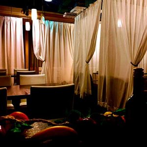 白い天蓋カーテンで覆われた半個室のテーブル席。4名様までご利用いただけます。