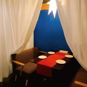 女性はいくつになってもお姫様に憧れるもの♪こちらは、白い天蓋カーテンで覆われた半個室のテーブル席。4名様までご利用いただけます。ブルーの壁に星形の照明が煌めき、まるで夜空を眺めているかのような雰囲気に。