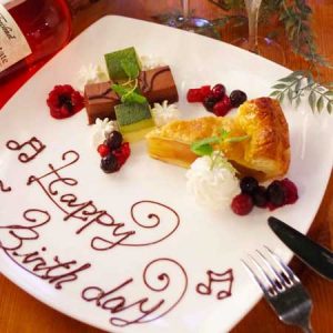 誕生日などの記念日にメッセージプレートはいかがですか?コースのデザートに無料でサービスさせていただきます。